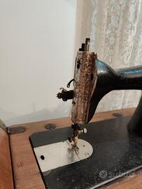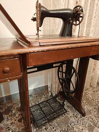 Antica macchina da cucire, ferma da tempo, con mobiletto di supporto.