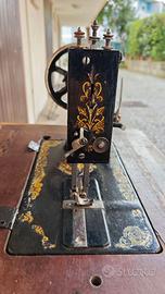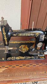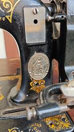 Singer sfinge, macchina tedesca prodotta tra il 1890 e il 1910, modello raro perchè distribuito da Clemens Müller di Dresda come si può vedere dallo stemma della donna con il leone e dalla scritta "The new Sewing Machine" che ne conferma la produzione per l'esportazione. Preferisco consegna a mano.