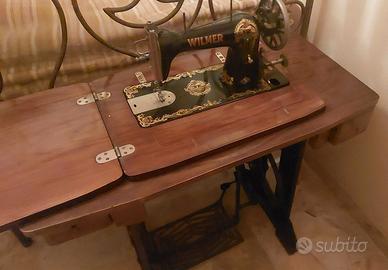 Macchina da cucire d’epoca Wilmer originale con mobile in legno e pedale in ghisa.