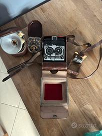 Macchina fotografica duplex, con esposimetro, flash e custodia in pelle