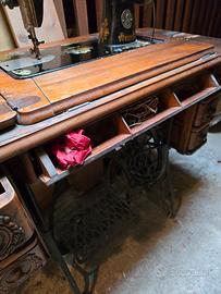 vendo macchina per cucire Singer originale, prodotta nel 1926, matricola Y 4355796, con pedale, 6 cassetti laterali intarsiati (3x2) ed 1 cassetto centrale in legno. Ripiano in legno e scheletro in metallo. Dotata di un flaconcino di olio lubrificante Singer originale. La macchina ruota su un perno e scompare nel suo vano in legno.