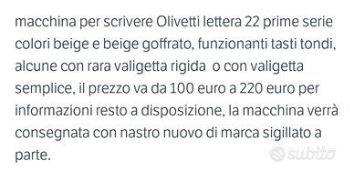 macchina per scrivere Olivetti lettera 22 vari modelli, colori disponibili solo beige e beige goffrato, perfettamente funzionanti, prezzi a partire da 120 euro con valigietta base sino a 220 con valigietta rara rigida di legno, guarda nel mio armadio per altre macchine per scrivere