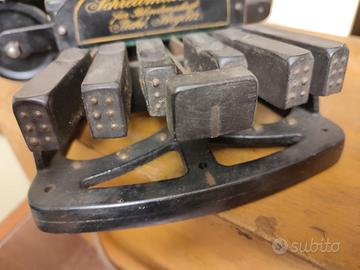 Vendo macchina per scrivere PICHT braille per non vedenti, DA MUSEO. Questo macchina storica e rara fu progettata da Oscar Picht (1871-1945), un insegnante per non vedenti tedesco, nel 1899. Fu la prima macchina per scrivere Braille utilizzabile in Europa e la produzione iniziò pochi anni dopo la sua invenzione. Presenta sei tasti principali, che corrispondono ai sei punti della cella Braille, più un tasto centrale più grande che funge da barra spaziatrice. Funziona premendo diverse combinazioni di questi sei tasti contemporaneamente, la macchina punzona i punti in rilievo sulla carta per formare le lettere dell'alfabeto e altri simboli. antica e rara, nell' immagine pubblicitaria c'è lo stemma dell'Impero Tedesco (Deutsches Reich) utilizzato tra il 1871 e il 1918. Macchina 33X22H12 - SCATOLA 35X26X15 completa di custodia in legno con foglio pubblicitario originale incollato al coperchio. meccanica funzionante e completa di tutto, parti dorate leggermente usurate nei lati, perfetta la scritta frontale, presenti segni del tempo, ossidazione epoca primi 900 POSSIBILITà DI VISIONE E RITIRO DI PERSONA. SPEDISCO SOLO CON MEZZI TRACCIATI PREVIO PAGAMENTO TRAMITE BONIFICO BANCARIO NON ACCETTO PAYPAL