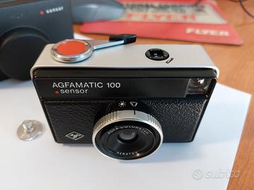 b) AGFA Agfamatic 100 Sensor, Made in Germany, per rullini 35 mm, completa di case (astuccio) originale
