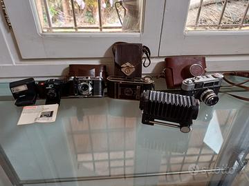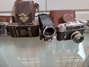Vendo antiche macchine fotografiche come da foto 1 Fed 4 con custodia- 1 Agfa Billy con custodia- 1 Voightlander Vito con custodia- 1 Minox con flash senza custodia - 1 dispositivo a Soffietto scrivo tutto non funzionante, erano di mio suocero e non ho idea se funzionano.