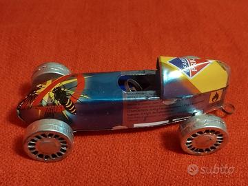 macchinina da corsa d'epoca, realizzata in Madagascar con latta di riciclo, proveniente da bombolette fi insetticida, dimensioni cm 15 x7 , altezza cm 5,5.
