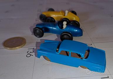 Lotto di 3 macchinine.Le 2 da corsa scala 1/77 sono una Maserati e una B.R.M.-G/PRIX (come si può vedere dalle foto le ruote anteriori di quest'ultima sono state cambiate) mentre l'altra è un Mercedes scala 1/87 della Lima e purtroppo è stata schiacciata.Contattare solo se veramente interessati.Grazie
