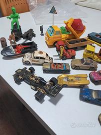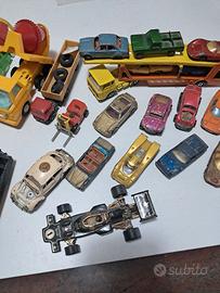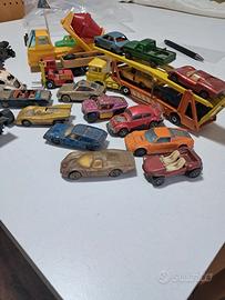 In blocco : 16 macchinine in metallo credo scala 1:43, 1 bisarca in metallo. 1 camioncino tir in plastica, 2 camioncini betoniera in plastica. 1 auto Jhon Player Special scala 1:36 .