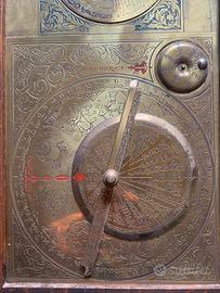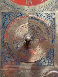 Curioso orologio degli anni 1920/30 realizzato in Italia con calendario perpetuo e misure dei segni zodiacali. Completo di chiave. Misure 63x23 profondità 11 cm