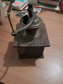 macinacaffè manuale d'epocain legno e metallo. Dettagli del Macinacaffè Struttura:È composto da una cassa cubica in legno con un piccolo cassetto estraibile alla base per raccogliere la polvere di caffè. Meccanismo:Sulla parte superiore è visibile la tramoggia in metallo (solitamente ottone o ferro) dove si inserivano i chicchi, sormontata dalla manovella necessaria per l'azionamento manuale. Marchio:Sulla parte frontale è presente unaplacca metallica ovalecon la dicitura "MARCA DEPOSITATA" e un logo centrale raffigurante un animale (probabilmente un leone o un grifone) intento a macinare, tipico dei produttori europei di fine '800 o inizio '900.