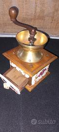 l oggetto nelle immagine è un macinacaffè manuale d' epoca, contenitore in ottone base in legno con decorazione in ceramica decorato con motivi floreale
