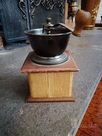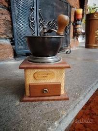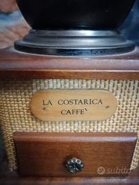 Splendido macinacaffè manuale vintage, marchiato "La Costarica Caffè". Un pezzo d'arredamento iconico che unisce l'eleganza del legno alla particolarità del rivestimento in paglia intrecciata sui lati, ideale per amanti del caffè, collezionisti o per dare un tocco rustico e "industrial" alla propria cucina.