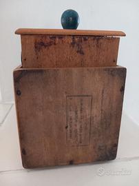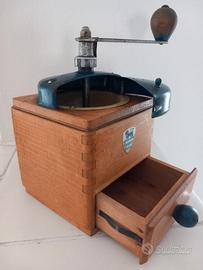 Macinino da caffè marchio Peugeot, anni '50, in legno con cupolino in acciaio bleu, cm. 11,5x11,5 altezza 21,5 al pomolo, pesa circa 900 grammi. Funzionante (testato macinando un cucchiaio di caffè), molto ben tenuto (vedi foto).