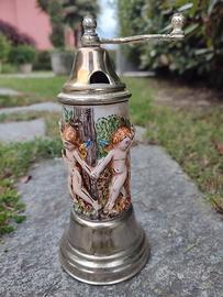 Macinino in porcellana Capodimonte con figure di putti in rilievo e finiture in metallo argentato lucido. Oggetto vintage (anni '60/'70), probabilmente con meccanismo carillon svizzero Reuge funzionante, che suona una melodia quando sollevato.