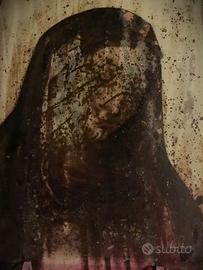 Descrizione: Questo dipinto di scuola seicentesca rappresenta una struggente Madonna Addolorata, figura centrale della devozione mariana. L’opera è realizzata a olio su rame, tecnica preziosa e raffinata, tipica delle committenze colte tra XVI e XVII secolo, nota per la capacità di mantenere colori brillanti e dettagli minuti nel tempo. La Madonna, velata in un ampio manto scuro, è raffigurata con il volto lievemente reclinato verso sinistra, in un’espressione di profonda mestizia e raccoglimento spirituale. I tratti somatici e le linee della veste, sebbene compromessi, restano visibili, lasciando intuire la qualità pittorica originaria. L’opera, non firmata, potrebbe essere attribuibile a un ambito italiano o iberico del XVII secolo, vista l’iconografia e il trattamento formale della figura sacra. La scelta del rame, spesso destinata a lavori di pregio, lascia ipotizzare una committenza devota e colta.