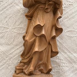 Vendo splendida scultura in legno massiccio, attribuibile probabilmente alla rinomata bottega Bernardi di Ortisei (Val Gardena), raffigurante la Madonna con Bambino in stile barocco. L'opera è un esempio d'eccellenza dell'artigianato gardenese, caratterizzata da un panneggio dinamico e profondo e da una dolcissima espressione dei volti. La finitura presenta una pregiata patina dorata originale che dona lucentezza e calore al legno. Dettagli dell'opera: Autore: Linea Bernardi (Wood Art Val Gardena). Altezza: 40 cm (peso 1.527 g) Materiale: Legno pregiato intagliato a mano. Stato di conservazione: Eccellente, integra in ogni parte. Autenticità: Riporta sul fondo il numero di serie N. 200/6 e conserva l'etichetta originale dell'epoca (prezzo 200.000 lire), che ne certifica l'acquisto in epoca pre-euro (fine anni '80 / anni '90) e l'appartenenza alle serie storiche più pregiate della zona. Un pezzo d'arte sacra di grande prestigio, ideale per impreziosire un ambiente o per un regalo di valore. Disponibile per ritiro a mano o altrimenti si consiglia la spedizione tracciata con imballaggio professionale ultra-protettivo.