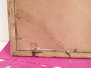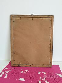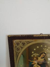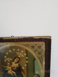 Splendida e suggestiva immagine devozionale raffigurante l'iconografia classica della Madonna di Pompei. La Vergine è seduta in trono con il Bambino Gesù, entrambi nell'atto di consegnare il Rosario a San Domenico di Guzmán e a Santa Caterina da Siena. Dettagli Artistici: La stampa è arricchita da una cornice architettonica a finto arco gotico con motivi a trifoglio negli angoli superiori. Attorno al capo della Vergine è presente la caratteristica corona di dodici stelle. Stato di Conservazione: L'opera presenta i segni del tempo che ne attestano l'autenticità, con alcune fioriture e ingiallimenti della carta che conferiscono un fascino vintage. La cornice è in legno lavorato a rilievo con motivi floreali/geometrici, con alcune mancanze della doratura e della finitura sui bordi (come visibile in foto). Curiosità: Sul vetro sono applicate due "immaginette" o santini d'epoca supplementari (uno raffigurante la Croce di San Giovanni della Croce e Santa Teresa, l'altro un angelo), che testimoniano l'uso devozionale domestico del pezzo.