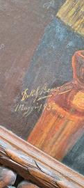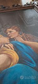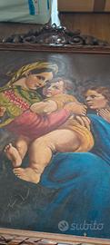 Madonna della Seggiola (Raffaello) - Olio su tela 1932 - Firma Dott. G. Benzoni Proponiamo in vendita un'opera di grande fascino e valore storico, datata Maggio 1932. Il dipinto è una raffinata esecuzione a olio su tela della celebre "Madonna della Seggiola" di Raffaello Sanzio. L’Autore e il Prestigio: L’opera reca la firma autografa "Dott. G. Benzoni". Il titolo accademico e il cognome rimandano alla storica e illustre tradizione artistica della famiglia Benzoni (celebri per lo scultore neoclassico Giovanni Maria Benzoni). La mano è quella di un esperto conoscitore della tecnica accademica del primo Novecento, capace di restituire con estrema dolcezza e maestria i volti e i volumi originali. Caratteristiche e Condizioni: Dimensioni Tela: 52 x 74 cm. Dimensioni Totali (con cornice): 77 x 95.5 cm. La Tela: Presenta una bellissima e uniforme crettatura naturale (craquelure), che garantisce l'originalità della pittura a olio e l'autenticità dell'epoca (1932). La Cornice: Vero punto di forza dell'opera. Si tratta di una maestosa cornice lignea dorata con intagli artigianali molto profondi a motivi di foglie d'acanto e volute. Come visibile dalle foto di dettaglio, la lavorazione è di altissima qualità e in ottimo stato di conservazione. Stato: Opera "in prima tela", mai rintelata, perfetta per collezionisti che cercano l'integrità e la patina originale. Prezzo: 800 € Un pezzo di estrema eleganza, ideale per studi professionali di prestigio, saloni classici o dimore storiche. Data l'importanza e la delicatezza della cornice intagliata, si predilige il ritiro a mano.