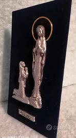 Madonna di Lourdes di peltro su cornice di velluto blu. Misure 19 cm per 11 cm. Quadretto da tavolo. E da muro.