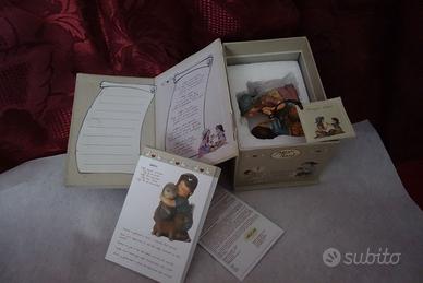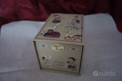 L'oggetto è nuovo, con la sua bella scatola in cartoncino rigido con chiusura a calamita, corredata di foglietto e del pieghevole con le immagini dei vari pezzi della magica collezione. C'e anche il bigliettino legato al braccio del piccolo elfo riportante il nome e il numero di codice del pezzo ("Elfi del Gioco" MGG02). Insomma, la confezione completa, e nuova.