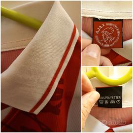 Maglia Ajax autoriprodotta dal club della stagione 1998-1999, etichetta taglia non presente ma dovrebbe essere una XL (ascella 60 cm circa; altezza 75 cm circa). Lo stemma del club è ricamato in rilievo e cucito sul tessuto, mentre lo sponsor commerciale è serigrafato sul tessuto. Sulla maglia davanti e dietro sono serigrafati il logo e la scritta del club. I polsini ed il colletto sono in maglia di poliestere. L'etichetta interna riporta il logo ufficiale del club. Articolo poco usato è in ottime condizioni generali e ben conservato.