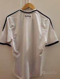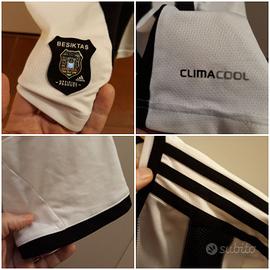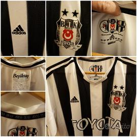 Maglia celebrativa dei 110 anni di fondazione del Besiktas stagione 2013-2014, marca Adidas made in Turchia, tg L (ascella 52,5 cm circa; altezza davanti 75 cm circa; dietro 79 cm circa). LO STEMMA DEL CLUB È OCCATO IN RILIEVO IN VELLUTO E TERMOSALDATO; IL COLORE È LIEVEMENTE SBIADITO COME DA DETTAGLIO FOTO; LO SPONSOR COMMERCIALE DAVANTI È TERMOAPPLICATO IN PLASTICA E PRESENTA ALCUNE LETTERE USURATE (VEDASI DETTAGLI FOTO). Ilo logo Adidas davanti è ricamato in rilievo in filo nero. La scritta CLIMACOOL in basso davanti a sx è termoapplicata, mentre la targhetta in tessuto con lo stemma del club e logo Adidas è cucita in basso a dx. La scritta del club sul retro sotto il colletto è termoapplicata in plastica nera. Le bande laterali Adidas lungo le spalle e maniche sono cucite sul tessuto. Articolo usato in ottimo stato e ben tenuto, nonostante i difetti menzionati.