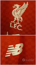 Maglia del Liverpool stagione 2015-2016, marca New Balance made nelle Filippine, tg M (ascella 52,5 cm; altezza 73,5 cm). Presenta i loghi del club e New Balance davanti in tessuto gommato e termosaldato, mentre lo sponsor commerciale è termoapplicato in plastichina bianca; sul retro dietro il colletto il logo col numero sono ricamati in rilievo in filo giallo dorato. Presenta targhetta argentata in gomma di prodotto ufficiale New Balance termosaldata sull'orlo inferiore davanti a sx. Articolo usato in ottime condizioni generali e ben conservato.