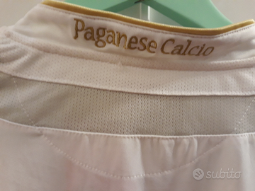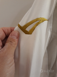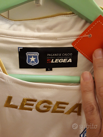 Maglia calcio a maniche lunghe NUOVA CON CARTELLINO, da trasferta della Paganese, marca Legea tg. L (ascella 57 cm; lunghezza maniche da polsino ad attaccatura colletto 83 cm circa; altezza davanti 72 cm; dietro 76 cm circa). Loghi Legea e stemma del Club sono ricamati in rilievo e termoapplicati tessuto. Presenta profili ed inserti color oro cuciti sul tessuto. IN ALCUNE PARTI DEL TESSUTO SONO PRESENTI DELLE PICCOLE TRACCE DI SPORCO PER VIA DEL COLORE BIANCO FACILMENTE SOGGETTO A SPORCARSI. La scritta sul retro del colletto è ricamata. Presenta targhette cucite interne ed esterne con stemma del club. Articolo mai usato ed è ancora col cartellino attaccato.