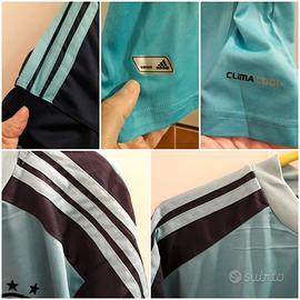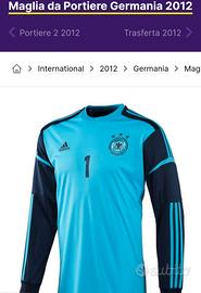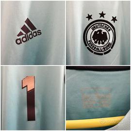 Maglia portiere a maniche corte della Germania, anno 2012, n. 1 Neuer, marca Adidas, versione replica da negozio, tg L (ascella 58 cm circa; altezza 72 cm circa). Lo stemma nazionale della federcalcio è floccato in vellutino nero, mentre il numero 1 e logo con scritta Adidas davanti sono termoapplicati in plastica blu navy. Sul retro nome e numero sono termoapplicati in plastica sottile blu navy senza difetti o segni di usura. Sotto il numero è termoapplicato il logo nazionale dell'aquila in plastica azzurra. Le bande laterali Adidas azzurre lungo le spalle e maniche sono cucite sul tessuto. In basso davanti sono termoapplicate la scritta CLIMACOOL e la scritta Adidas. Articolo poco usato è in ottime condizioni generali e ben tenuto.