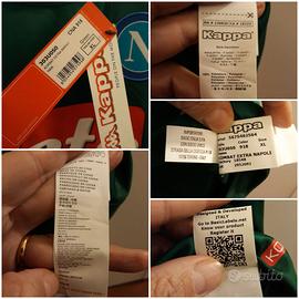 Maglia portiere a maniche corte del Napoli, stagione 2017-2018, modello versione da negozio, marca Kappa made in China, tg XL (ascella 53,5 cm circa; altezza 73 cm circa). Lo stemma del club è ricamato in rilievo; la scritta Kappa, e gli sponsor commerciali davanti e dietro sono termoapplicati in plastica. I loghi Kappa su entrambe le maniche sono termoapplicati in plastica sottile bianca. Articolo nuovo con cartellino e confezione originale.