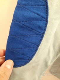 Maglia da portiere retro anni 80-90, in cotone poliammide, marca Diadora, tg 5 equivalente ad una L (ascella 52,5 cm circa; altezza 74-75 cm circa; lunghezza maniche da polsino ad attaccatura colletto 78 cm circa). ARTICOLO COME NUOVO SENZA CARTELLINO. Presenta logo Diadora davanti floccato in velluto blu. Le imbottiture alle spalle e gomiti sono cucite sul tessuto.