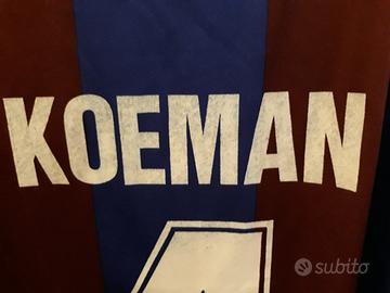 Maglia del Barcellona retro personalizzata col n 4 Koeman; trattasi di un remake. la taglia non è presente ma dovrebbe essere una XL (ascella 58 cm circa; altezza 72 cm circa). Il nome e numero sono termoapplicati in plastica sottile bianca, mentre lo stemma del club è ricamato in tessuto in rilievo e cucito sulla maglia. Articolo usato, in ottime condizioni generali e ben conservato.