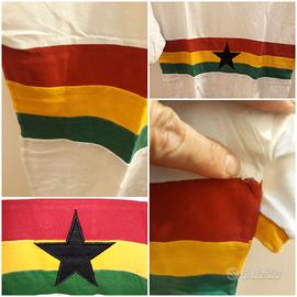 Maglia calcio in cotone del Senegal anni 80, marca Clube Retro, tg M (ascella 51 cm circa; altezza 69 cm circa). Gli inserti laterali gialli lungo le spalle e maniche sono cuciti sul tessuto. L'inserto orizzontale tricolore verde, giallo e rosso con la stella nera è cucito sul tessuto davanti e dietro; la stella nera centrale davanti è ricamata in rilievo in tessuto nero. È PRESENTE UN PICCOLO PUNTO DI SCUCITURA SULL'INSERTO CENTRALE NEL TESSUTO ROSSO IN ALTO A SX (VEDASI DETTAGLI FOTO). In basso davanti a sx è cucita targhetta in tessuto con indicazione della taglia e del marchio tecnico. Articolo poco usato, con la confezione e e cartellino originale, è nel complesso in ottimo stato e ben conservato.