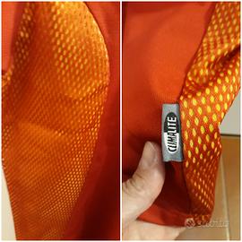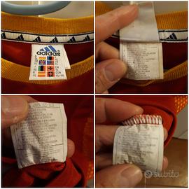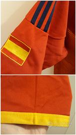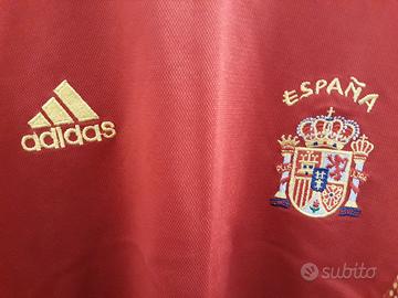 Maglia della Spagna periodo 2001-2003, marca Adidas made in Indonesia, tg XL (ascella 56 cm circa; altezza davanti 73 cm circa; dietro 79 cm circa). Lo stemma della federcalcio ed il logo Adidas sono ricamati in tessuto in rilievo e termosaldati. La bandiera nazionale sulla manica dx è ricamata in tessuto in rilievo e termosaldata, mentre le tre bande Adidas blu scuro lungo le spalle sono cucite sul tessuto. Articolo usato, in ottime condizioni generali e ben conservato.
