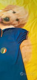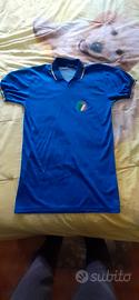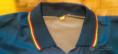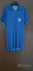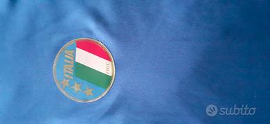 MAGLIA per gioco CALCIO della nazionale ITALIANA realizzata nel 1982 in occasione de MONDIALWE di calcio vinto, catalogazione VINTAGE, con scudetto cucito della F.G.C.I. ( Federazione gioco calcio italiana ) con impresse le 3 stelle rappresentanti i 3 mondiali vinti in precedenza, Il logo che coniuga tradizione e modernità, con il tricolore della bandiera e l'azzurro della maglia sovrastati dalla scritta Italia e dalletrestelle che simboleggiano le Coppe del Mondo vinte (1934, 1938, 1982 )