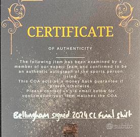 Maglia Jude Bellingham finale di Champions Real Madrid 2024 autografata. Maglia comprata su un noto sito di aste con certificato di autenticità in foto emesso dal venditore. Spedisco anche una targhetta e due fotografie utili per incorniciarla. Spedizione assicurata e tracciata.