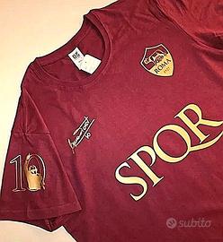 Maglia nei colori storici dell'AS Roma, oro e rosso pompeiano, riporta la scritta SPQR al posto dello sponsor, la patch celebrativa di Totti sulla spalla ed il suo autografo sul petto.