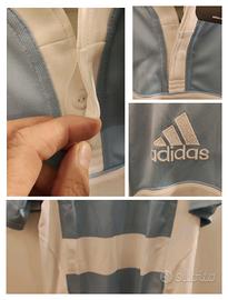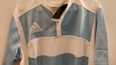 Maglia rugby stile Pumas dell'Argentina, da collezione,marca Adidas, made in China, tg XL (ascella 62 cm circa altezza 77 cm circa). Presenta colletto alla coreana chiuso da un bottone in gomma con asola mentre un bottone di scorta è cucito su etichetta interna. La scritta ed il logo Adidas davanti sono ricamati in filo bianco in rilievo. In basso davanti a sx è termo applicata la scritta Climacool in plastica sottile. Sul retro sotto il colletto è ricamato in filo turchese in rilievo il logo Adidas. Articolo nuovo con cartellino.