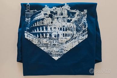 Colore blu navy, tessuto tecnico traspirante Roly Sport, taglia L (EU/UK), con stampa serigrafica bianca che raffigura il Colosseo e i principali monumenti di Roma.