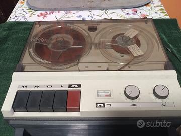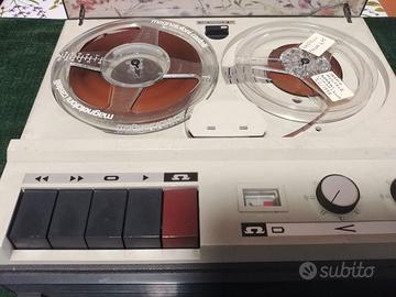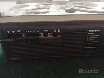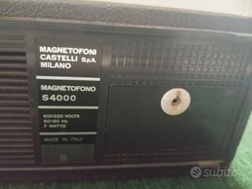 Magnetofono Castelli a bobine anni 70. Modello S4001 Comprende due bobine a nastro, cavo di alimentazione. Il copetchio si apre e chiude correttamente ma é stato incollato sull'angolo destro come da foto. Le bobine girano ma manca microfono quindi non garantisco il funzionamento.