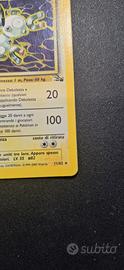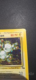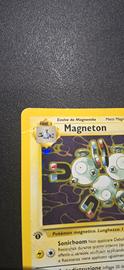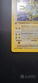 In vendita rara carta Pokémon Magneton (11/62) olografica, appartenente alla storica 1ª Edizione del set Fossil (Wizards of the Coast, 1999/2000). Un pezzo immancabile per ogni collezionista dell'era vintage. Analisi dettagliata della carta: Fronte (Front): Eccellente impatto visivo. La centratura è molto buona e i bordi gialli sono puliti. La lamina olografica mantiene un'ottima lucentezza originale, con solo lievissimi segni superficiali (hairline scratches) visibili solo in controluce. Retro (Back): Conserva una buona saturazione del colore blu. Si segnala un leggero "whitening" (punti bianchi) lungo i bordi e sugli angoli, tipico del tempo, che non compromette però l'estetica generale della carta. Condizioni Generali: Classificabile come Excellent (EX) / Lightly Played (LP). La carta è strutturalmente integra, senza pieghe (creases) o segni di umidità. For sale: Rare holographic Magneton (11/62) Pokémon card from the iconic 1st Edition Fossil set (Wizards of the Coast, 1999/2000). A must-have piece for any vintage era collector. Detailed Condition Analysis: Front: Excellent eye appeal. The centering is very strong, and the yellow borders remain clean. The holographic foil retains a beautiful original luster, with only very minor surface hairlines visible under direct light. Back: The blue color remains vibrant and saturated. There is some light "whitening" along the edges and corners, which is typical for vintage cards of this age, but it does not detract from the overall display quality. Overall Condition: Rated as Excellent (EX) / Lightly Played (LP). The card is structurally sound, with no creases, bends, or water damage.