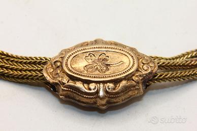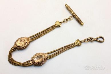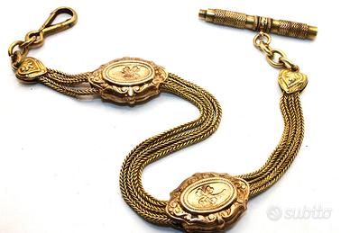 Questa splendida catena da orologio risale alla metà dell'Ottocento, in pieno periodo Napoleone III, e rappresenta un esempio eccellente di alta artigianalità orafa dell'epoca. Realizzata in metallo dorato con una ricca finitura antica, la catena è composta da tre file di maglia foxtail flessibile, intervallate da raffinati medaglioni ovali decorati con motivi a quadrifoglio sbalzati e cornici a volute. Il pezzo è completo di un moschettone funzionale a un'estremità e di una classica barra a T finemente incisa all'altra. Con una lunghezza di 25 cm e un peso di 21 grammi, è un oggetto da collezione di grande fascino storico, perfetto per completare un orologio da taschino d'epoca o per essere indossato come prezioso bracciale vintage.