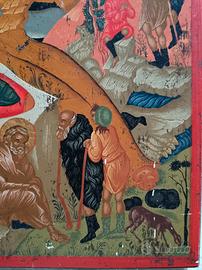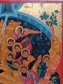 Poche opere di soggetto religioso possono arrivare all’anima come le icone ortodosse, per il loro accompagnarci nel piacere estetico e nella Fede attraverso i colori e la dolcezza delle immagini. Questa icona, che raffigura un’affollata Natività di Gesù, è un’opera di ottimo livello, prodotta in ambito russo o greco, nel XX secolo, realizzata su tavola di ulivo e dipinta rigorosamente a mano, con finitura in oro zecchino. Per affinità stilistica dovrebbe trattarsi di un’icona dipinta dai monaci del Monte Athos. Un dipinto meraviglioso per qualsiasi ambiente e soprattutto ideale per il Natale, per essere esposto nel periodo dell’Avvento al posto del più tradizionale Presepio con le statuette. Un’icona è anche il regalo perfetto per un matrimonio, un battesimo o a quanti sanno apprezzare l’universalità dell’Arte e della Fede. L’icona è molto ben conservata, con piccoli strisci ben evidenziati dalle foto. Non presenta cadute di colore o danni maggiori.