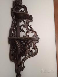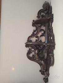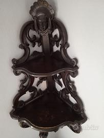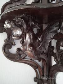 Raro e magnifico pensile da angolo, di manifattura veneziana-veneta della seconda metà del XIX secolo. Scolpita nel legno ebanizzato, presenta una figura di drago e una testa allegoria dell’America, sulla parte sommitale. L’oggetto è proveniente dall’arredo di un appartamento di Venezia, dove è sempre rimasto dalla sua origine. L’oggetto è assolutamente originale, solido e integro in ogni suo dettaglio.