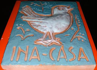 Bellissima e introvabile mattonella decorativa in maiolica policroma vintage da collezione, anni 50, con disegno in rilievo e scritta incisa, vera icona dell'architettura dell'Ina Casa. La targa è originale, integra, mai posta in opera.