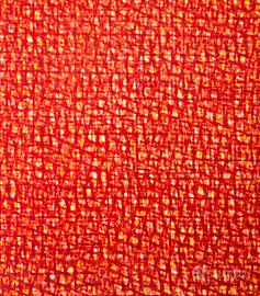 Manifesto originale realizzato per la mostra personale di Piero Dorazio presso la Galleria d’Arte Niccoli di Parma, tenutasi tra il 22 febbraio e il 30 marzo 1990. L’immagine è interamente costruita su una trama fitta di segni intrecciati, dominata da una vibrante gamma di rossi, aranci e gialli, che genera un effetto di pulsazione luminosa e profondità ottica.