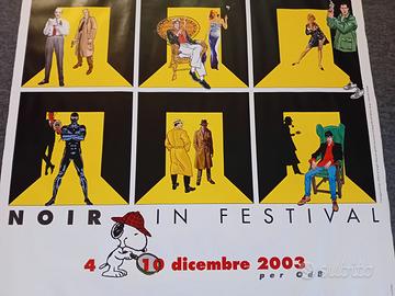 Manifesto Poster "Courmayer Noir in Festival 2003". Manifesto realizzato per l'edizione del 2003 del Festival dedicato al noir, al cinema ed alla letteratura giallistica che si tiene a Courmayer e che ha preso l'eredità del Mystfest. Questo manifesto in particolare, così come questa edizione, è in parte dedicata ad Oreste del Buono (OdB). "Nel 2003 ci lasciava, a pochi mesi dal Festival, il nostro presidente OdB. Il mitico Oreste del Buono era stato lo scopritore italiano di Snnopy sulle pagine di Linus e per questo li troviamo idealmente insieme sul manifesto che fu una realizzazione eccezionale. Nel nome di ObD trovammo la complicità di Sergio Bonelli che fece appositamente disegnare dai suoi autori tutti i grandi personaggi del mystery in 9 quadri d’autore che riassumono le passioni di OdB." (Tratto da Noir Film Festival).