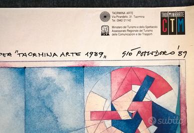 Manifesto poster realizzato da Giò Pomodoro per "Taormina Arte '89". Giò Pomodoro è stato un importante scultore, incisore, disegnatore e artista italiano noto per le sue opere astratte, dell'arte informale e dell'astrattismo geometrico del secondo dopoguerra. Scomparso nel 2002, iniziò la sua carriera negli anni '50 a stretto contatto con il fratello scultore, Arnaldo Pomodoro. Si interessò al rapporto tra arte e spazio pubblico realizzando numerose opere. Le sue opere sono state esposte a livello internazionale. Già Pomodoro ha lavorato nel contesto di importanti manifestazioni culturali italiane tra cui "Taormina Arte" per la quale ha realizzato il manifesto qui in vendita. Il manifesto reca la scritta (probabilmente il titolo stesso del disegno): ""Il sole ha la larghezza di un piede umano" Eraclito sulla sezione aurea per "Taormina Arte"" ed a seguire la firma (stampata ovviamente) "Giò Pomodoro '89". Ottime condizioni generali tenuto conto dell'età e della conservazione (si nota un lieve taglio in un lato, senza perdita della carta). Dimensioni importanti di 95 x 67,5 cm, che lo rendono un manifesto in grado di arredare una parete di una sala. Il manifesto è originale. Al momento si trova disteso e sarà inviato arrotolato all'interno di un tubo di cartone per poster e manifesti.