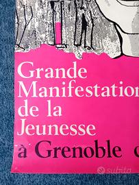 Poster manifesto originale "“ZOOM 68 – Grande Manifestation de la Jeunesse – Grenoble 1968". Manifesto realizzato per pubblicizzare la grande manifestazione giovanile tenutasi a Grenoble, in Francia, dal 19 al 21 luglio 1968. Sebbene non sia uno degli eventi più noti legati al “movimento del ’68” francese (il periodo di contestazione e proteste studentesche che ebbe il suo apice a maggio-giugno 1968), possiamo inquadrare la “Grande Manifestation de la Jeunesse” come uno dei festival o raduni giovanili organizzati nel clima di rinnovamento culturale e contestazione politica del periodo e nel pieno dell’ondata di fermento politico-culturale del Sessantotto francese. Manifesto di interesse storico e collezionistico, anche per chi si occupa di memorabilia legata al Sessantotto o di grafica degli anni Sessanta. Il manifesto è stato realizzato da B.R.E.G. e stampato a Parigi. Il design e la grafica del manifesto (con cerchi concentrici, colori vivaci come il fucsia/rosa, figure giovanili stilizzate) è molto tipico dello stile psichedelico e pop degli anni Sessanta, coerente con la grafica “di contestazione” o “di avanguardia” del periodo. Manifesto molto raro (ne ho trovato solo uno in rete venduto all'asta) perchè realizzato per essere affisso sui muri delle città francesi, per cui è introvabile. Il manifesto si trova in ottime condizioni generali, anche se può avere lievissime imperfezioni date dal tempo e dalla conservazione. Dimensioni 77x 58 cm. Al momento si trova disteso e sotto pressione. Verrà inviato all'interno di un tubo di cartone rigido. Per altre foto non esitate a chiedere.