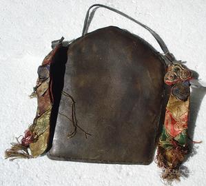 MANJUSHRI MERAVIGLIOSO ANTICO E MASSICCIO AMULETO IN BRONZO SIMBOLO DI SAGGEZZA E ILLUMINAZIONE RIFINITO IN PELLE CON DECORAZIONI LATERALI IN STOFFA